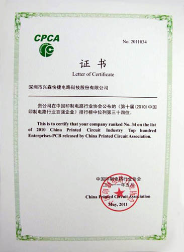 ,名列《第十届(2010)中国印制电路行业百强企业》排行榜中第三十四位。